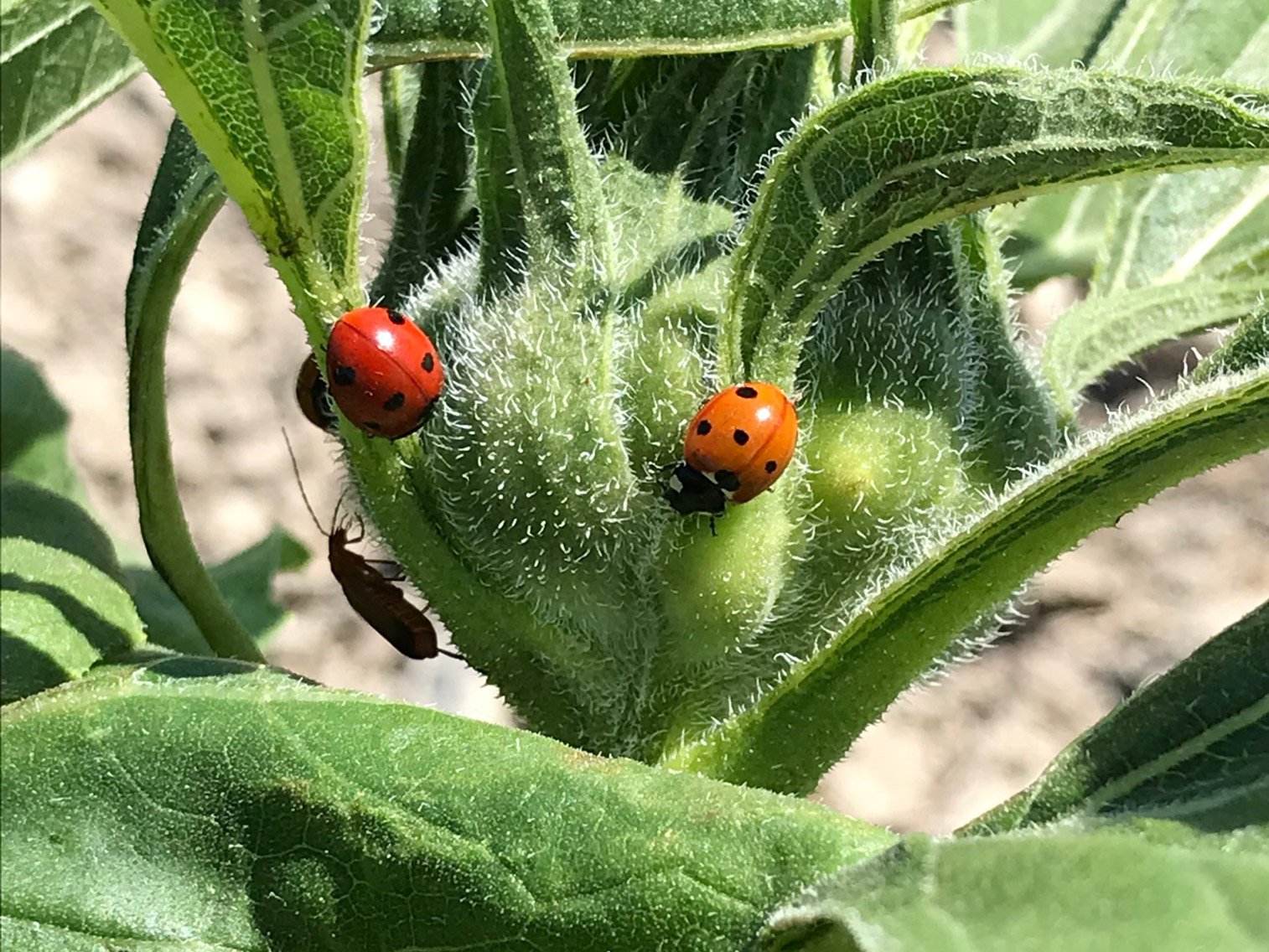 Plus étonnant encore, on retrouve adossé à un pied de courges ou en lisière de parcelle, des fleurs ! En plus de sentir bon et d’ajouter une ambiance bucolique aux parcelles de Laurent, elles offrent un habitat idéal pour une ribambelle d’insectes auxiliaires comme l’abeille, le macrolophus caliginosus ou la coccinelle. Ces insectes font partie d’une grande liste d’insectes que l’on appelle les auxiliaires de culture. Dans le cas de l’abeille, sa présence permettra la pollinisation des cultures et dans le cas des macrolophus caliginosus ou de la coccinelle, ils sont les ennemis naturels des ravageurs des cultures, permettant ainsi de les contrer naturellement.